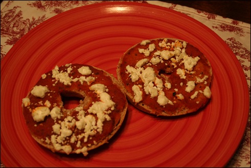 We didn’t get home until after 8 so I made us a quick and easy dinner. Whole wheat bagels with marinara sauce and goat cheese, pizza’s! I should of had some greens with it, but I was lazy and tired.