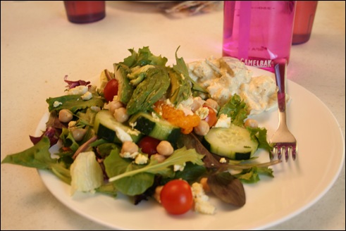 For lunch I enjoyed a black bean burger with a salad, beans, and a little potato salad. Not your typical camp food ;).